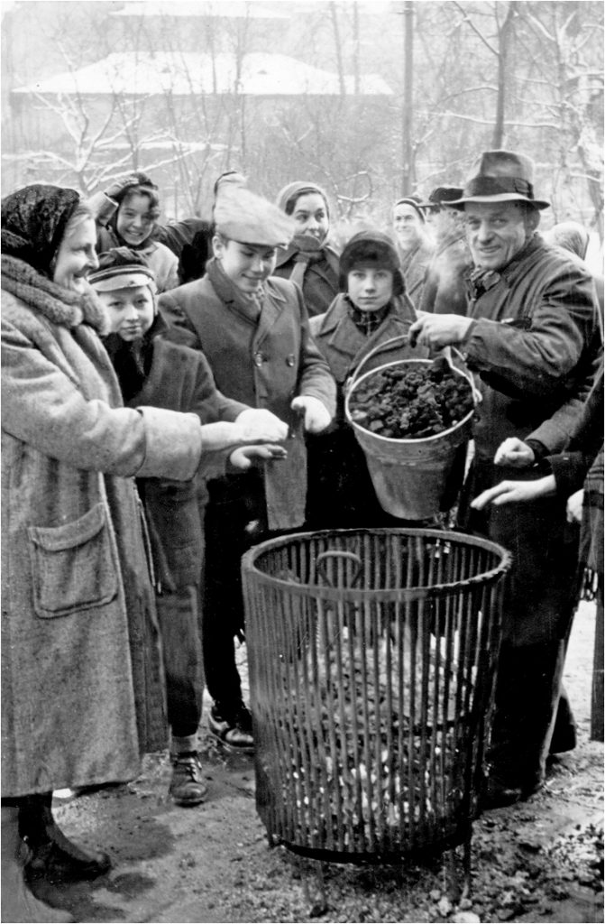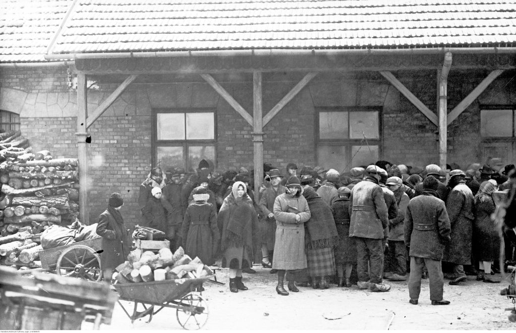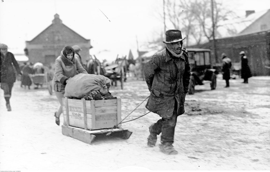 Dramatyczną sytuację, w jakiej znaleźli się zwłaszcza ubożsi mieszkańcy Krakowa, ukazują fotografie wykonane w lutym pod Miejskim Składem Węgla przy al. 29 Listopada 18. Na pierwszej widać zmarznięty tłum piętrzący się przed składem w oczekiwaniu na transport opału. Pozostało jeszcze zeskładowane drewno, na które było zapewne mniej chętnych. Drugie ujęcie przejmuje smutkiem, choć pokazuje szczęśliwą nabywczynię około 150 kg węgla. Kobieta w średnim wieku pomaga tragarzowi ciągnącemu prowizoryczne sanki. Na pozór ubrana jest elegancko, ale zwraca uwagę jej letnie obuwie. Tak to już bywa, kiedy przychodzi stanąć przed wyborem: zimowe buty dla siebie czy węgiel do ogrzania mieszkania dla rodziny. Tragarz z kolei ma buty (?) obwiązane dodatkowo szmatami. Jak widać, byli biedni i biedniejsi…